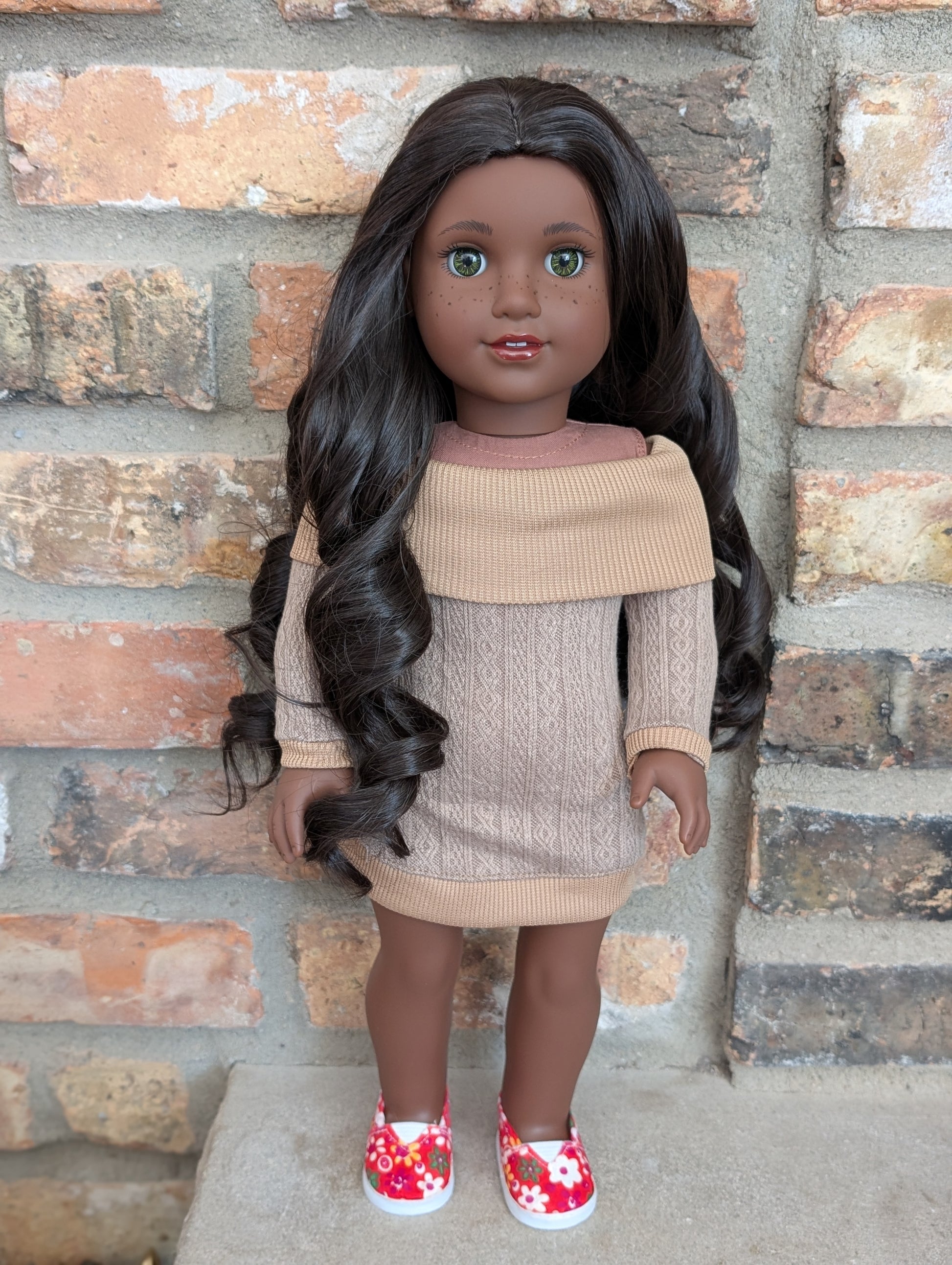 This one of a kind OOAK custom American Girl doll was created with a brand new doll, a dark brown wig, and hazel eyes. She has lip gloss and freckles that were hand painted and sealed. She may have some minor shine marks from handling. She comes with the outfit pictured.