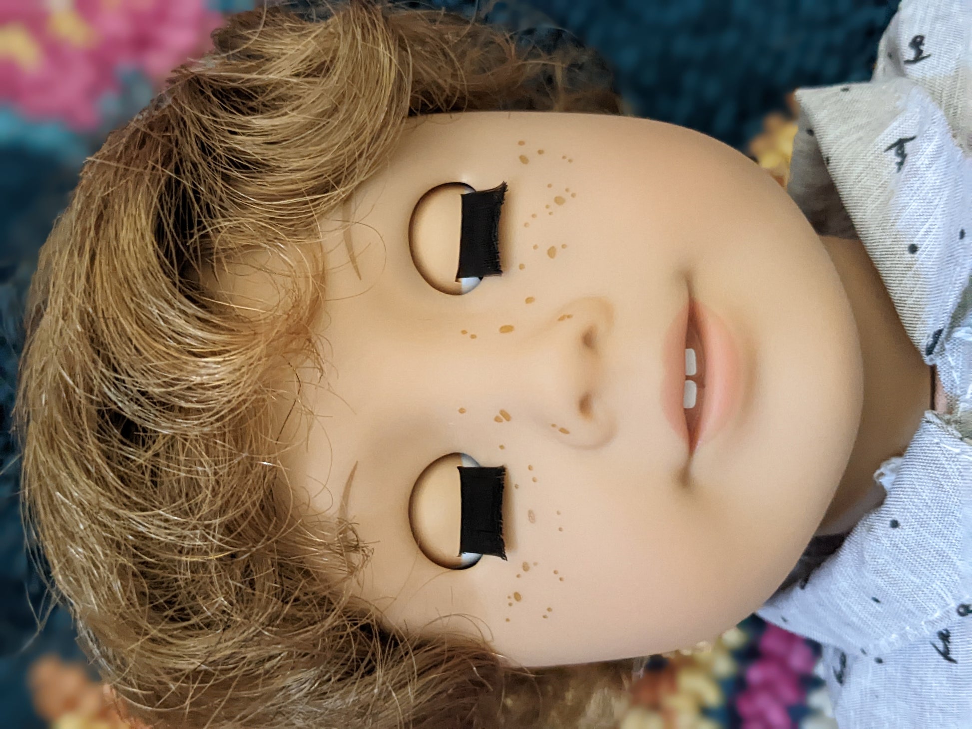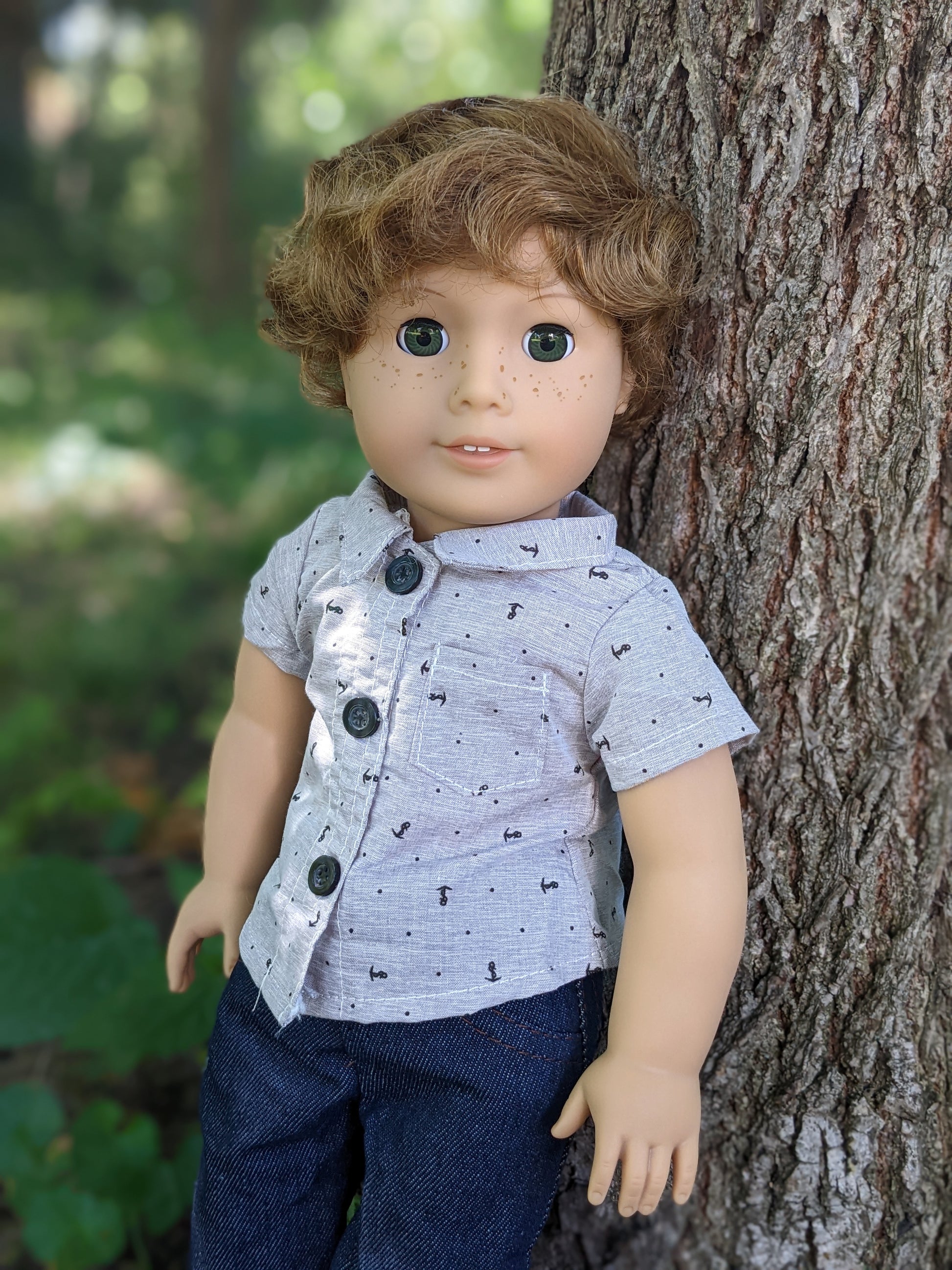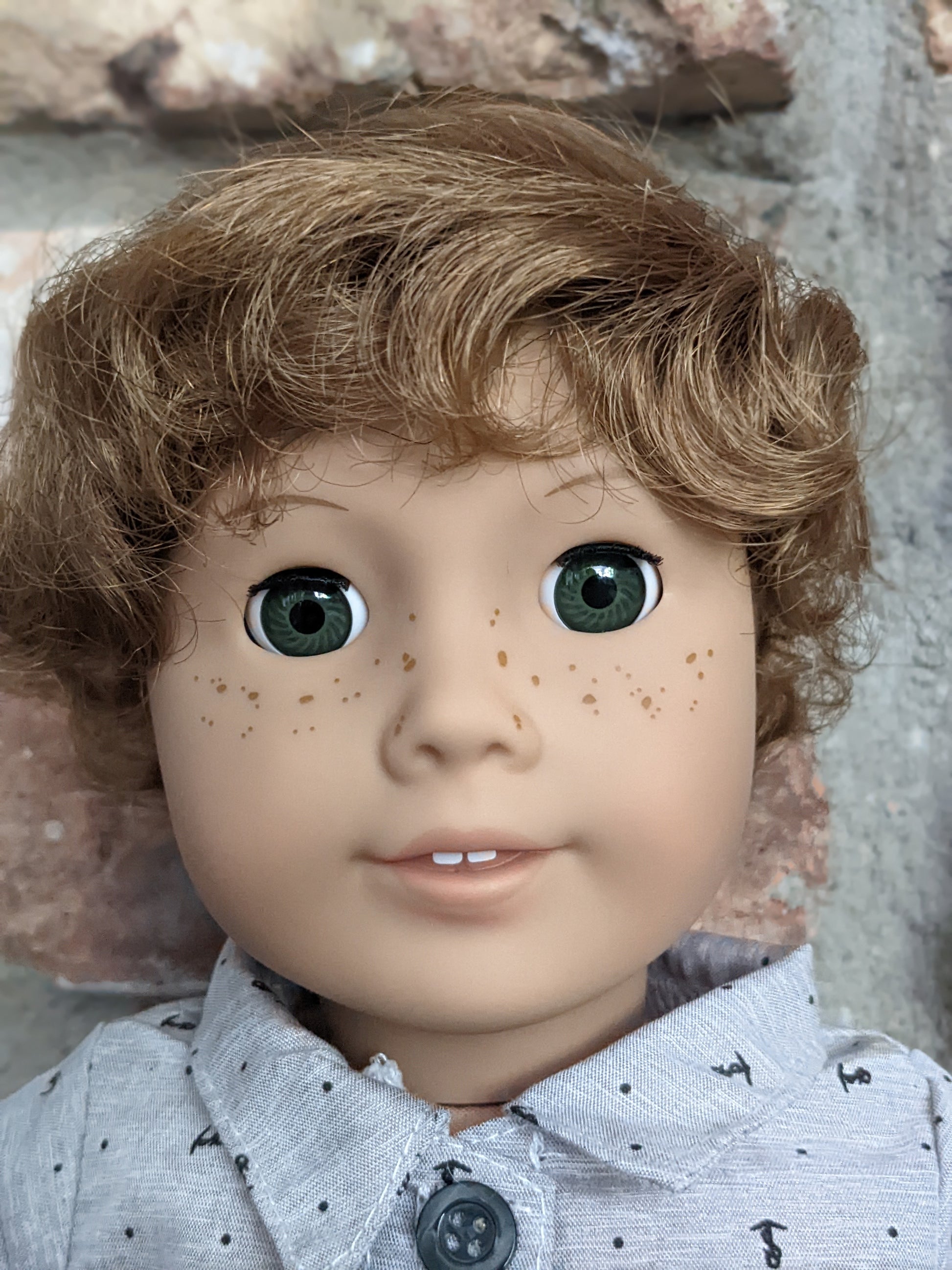 This one of a kind OOAK custom American Girl doll was created with a brand new Truly Me doll, a new wig, and green eyes. He may have some minor shine marks from handling. He comes with the outfit pictured. He has the two part eyes with white posts used by American Girl around 2017-2019.