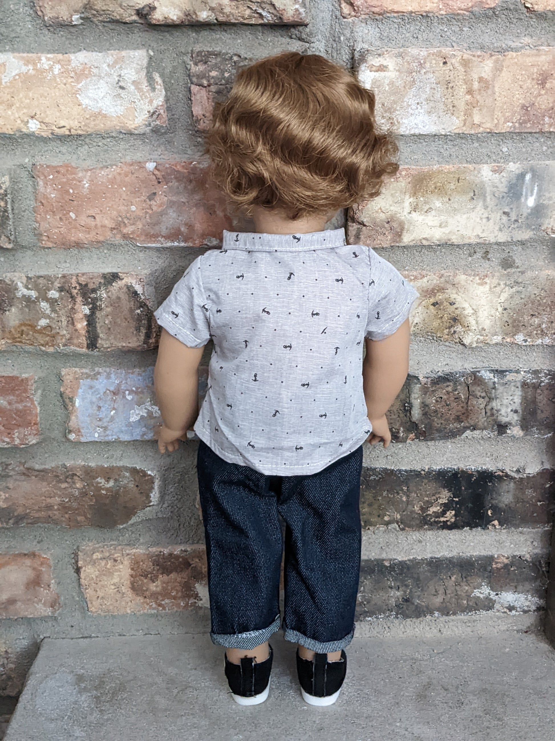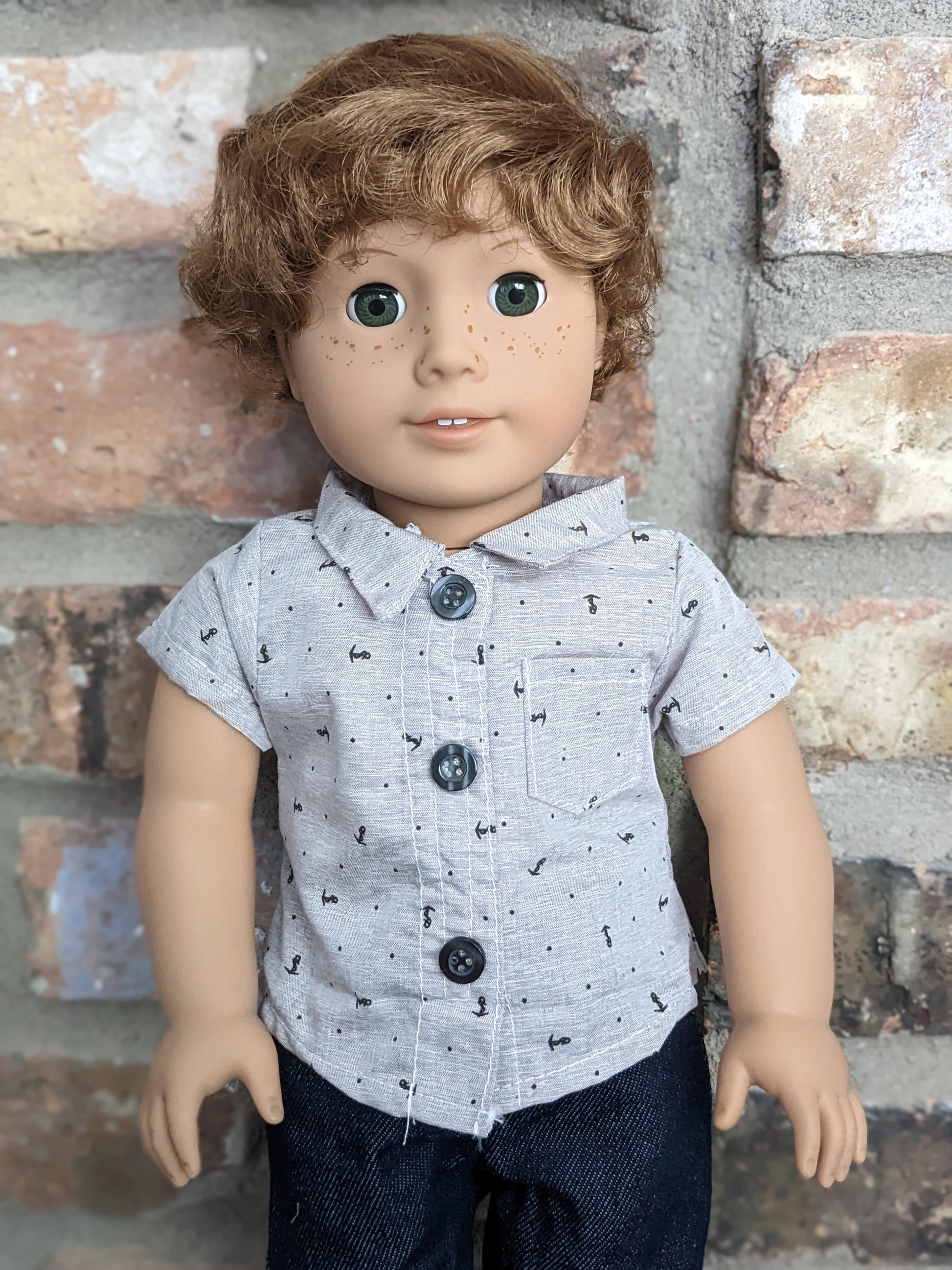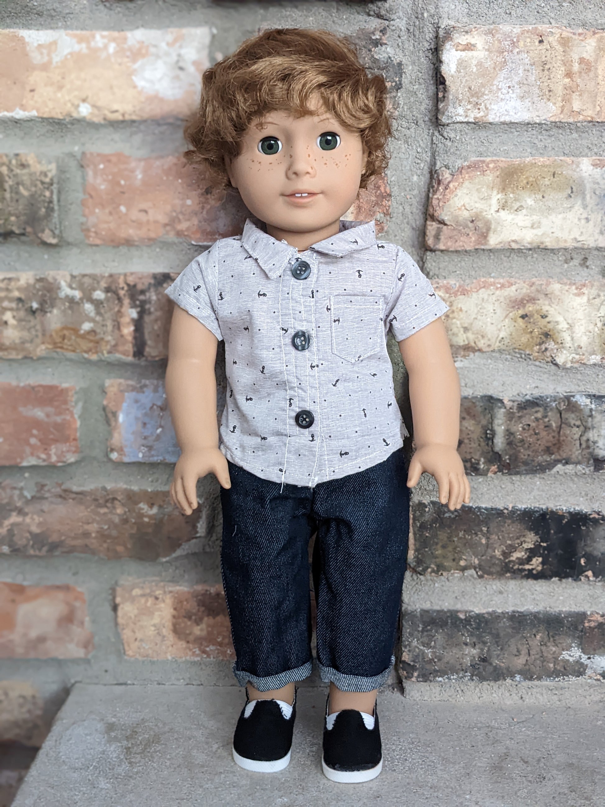 This one of a kind OOAK custom American Girl doll was created with a brand new Truly Me doll, a new wig, and green eyes. He may have some minor shine marks from handling. He comes with the outfit pictured. He has the two part eyes with white posts used by American Girl around 2017-2019.