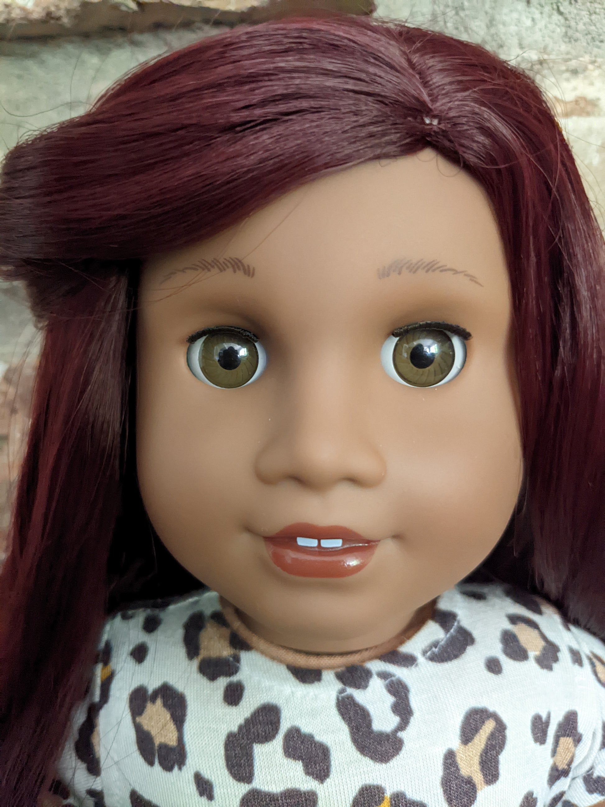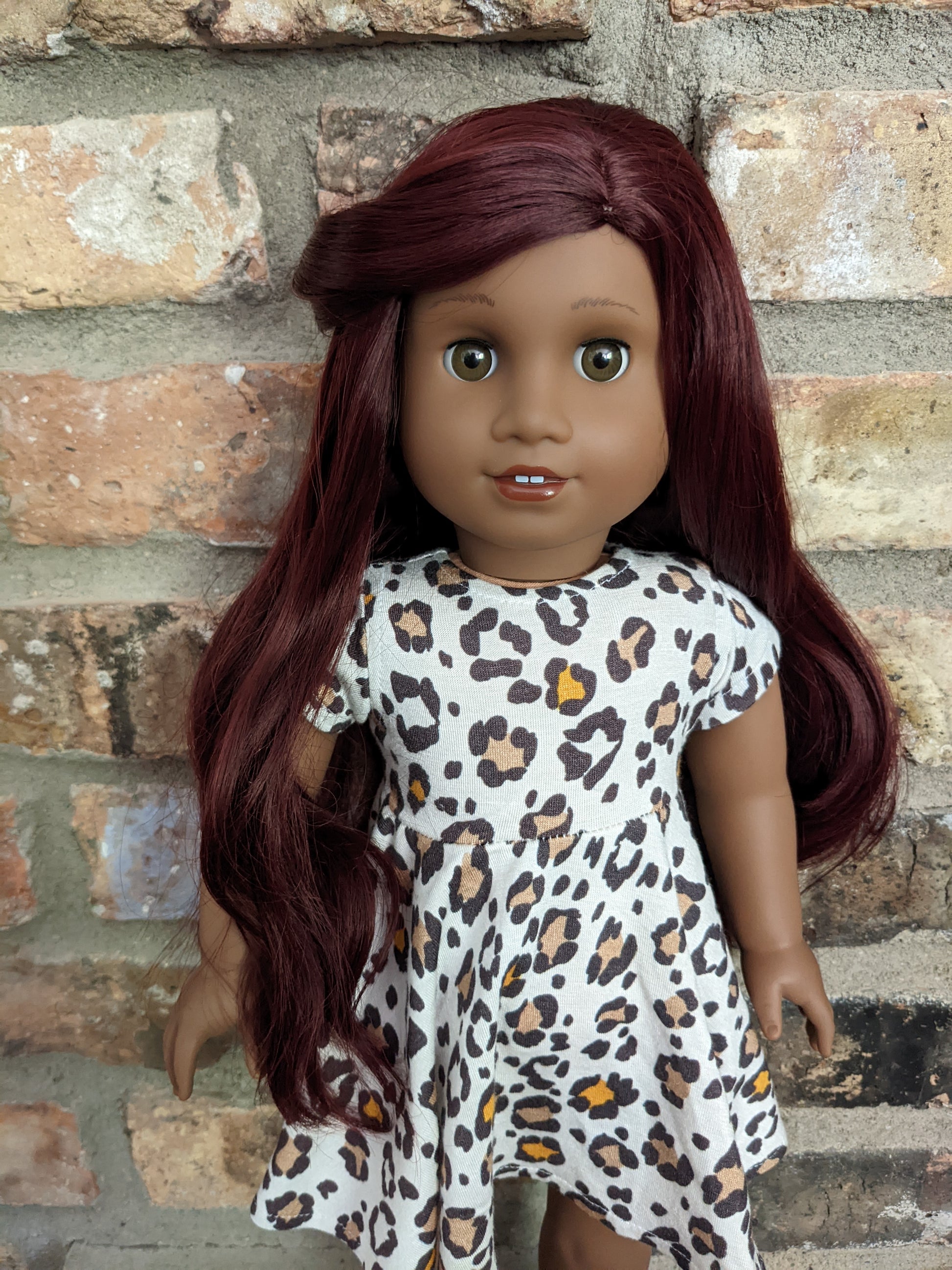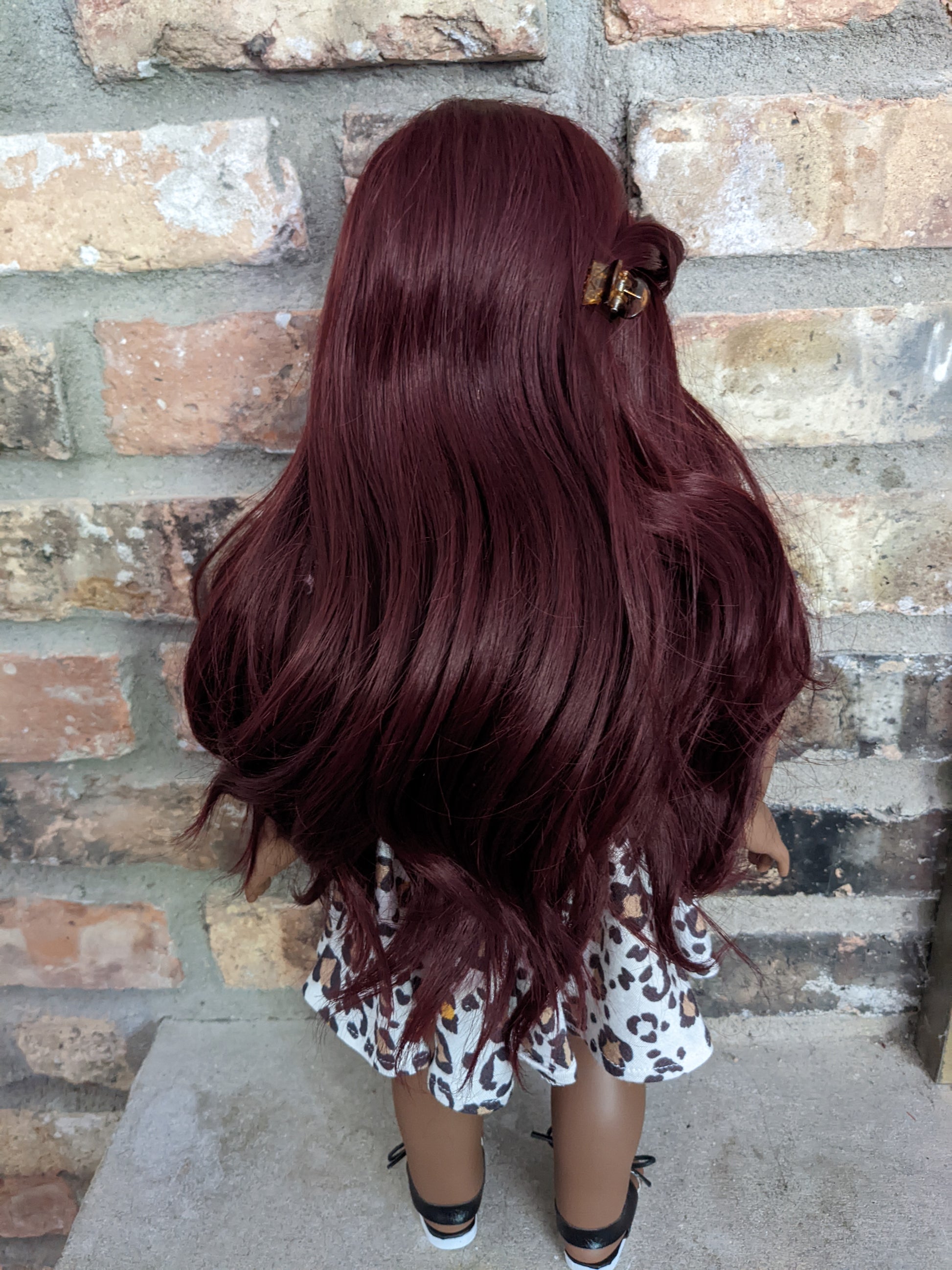 This one of a kind OOAK custom American Girl doll was created with a brand new Sparkling Ballerina doll, a burgundy wig, and amber eyes. She has lip gloss that was hand painted and sealed. She may have some minor shine marks from handling. She comes with the outfit pictured.