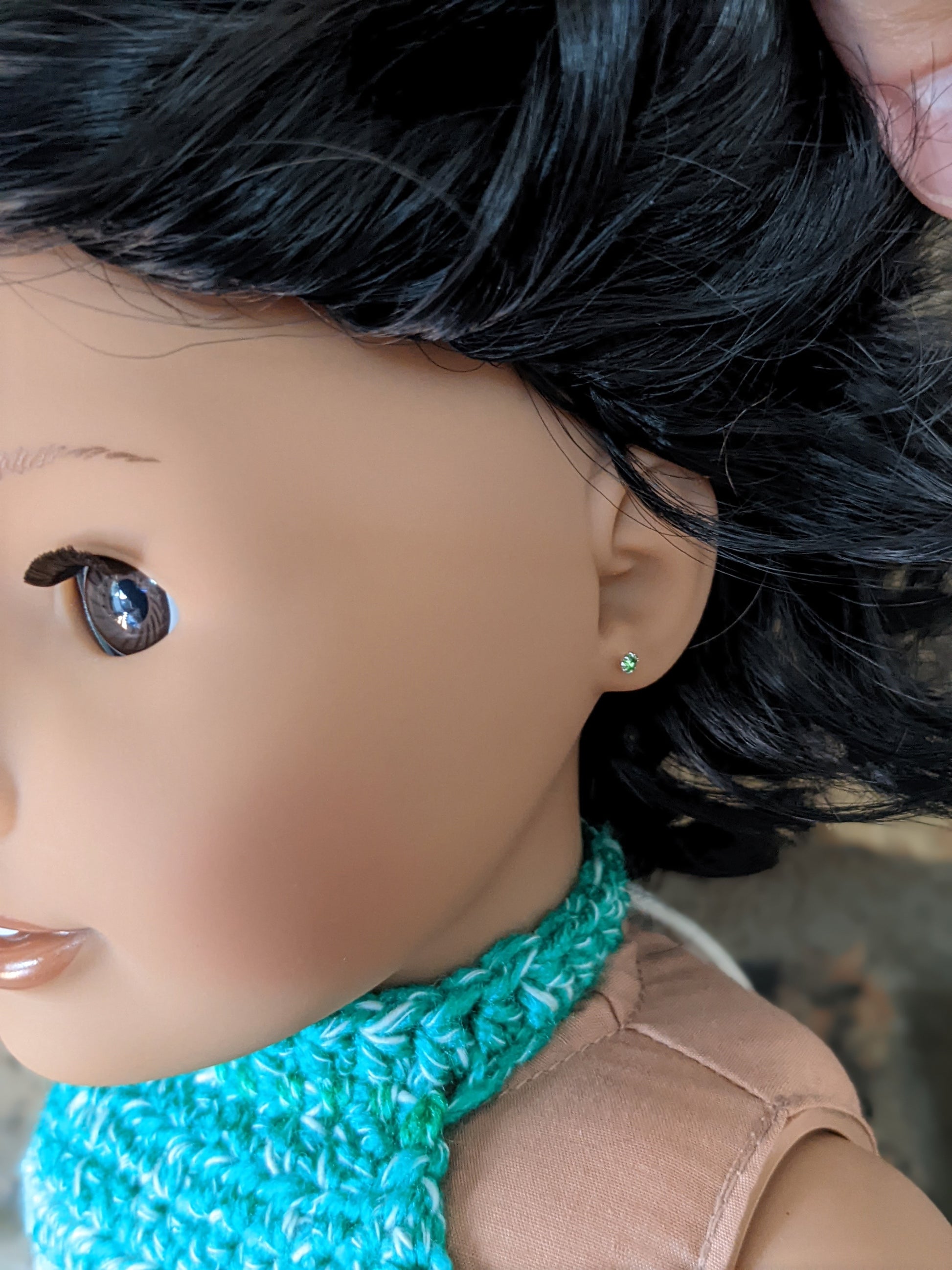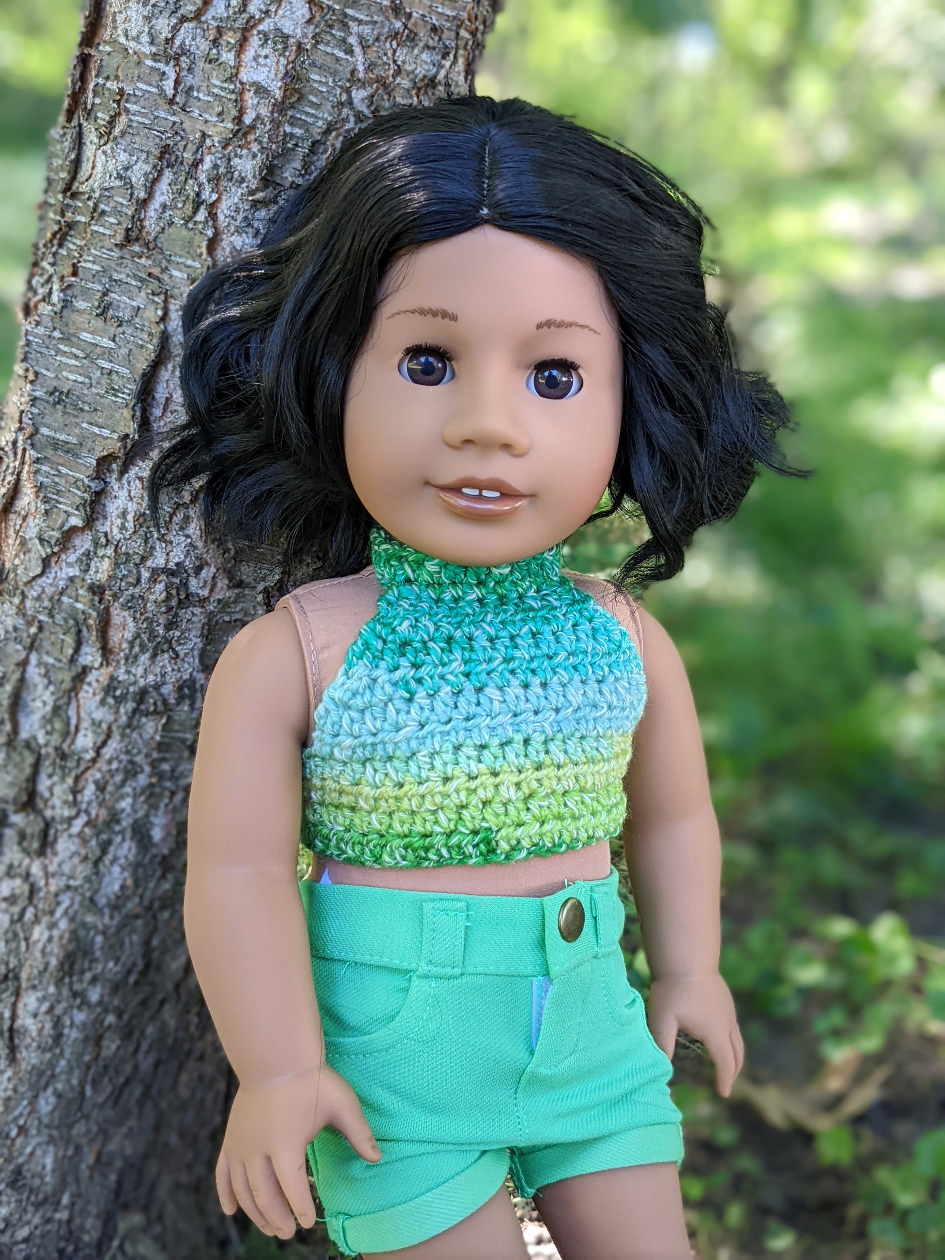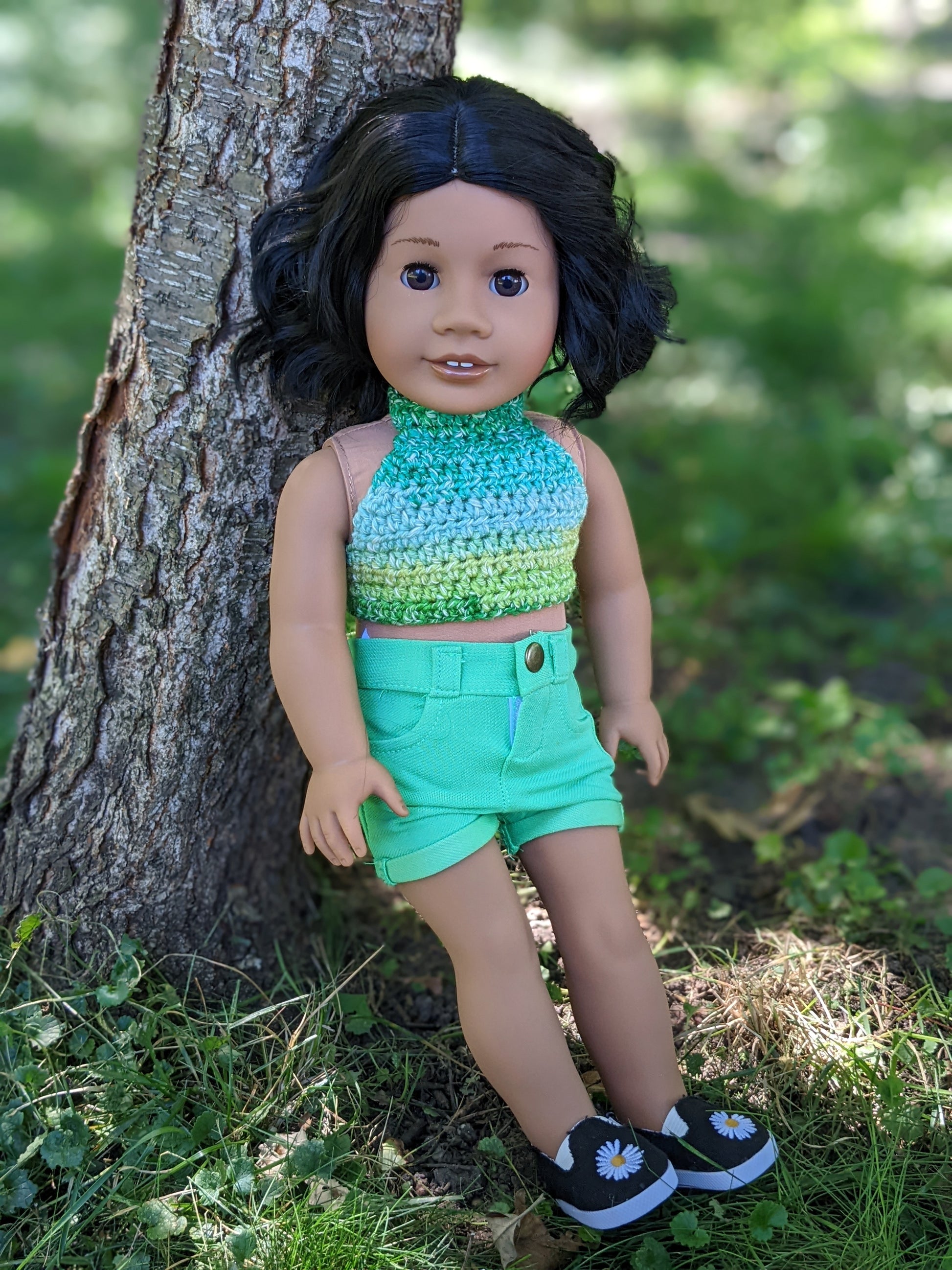 This one of a kind OOAK custom American Girl doll was created with a brand new Truly Me doll, a black wig, and brown eyes. She has lip gloss that was hand painted and sealed. She may have some minor shine marks from handling. She comes with the outfit pictured. She has the microfiber cloth body with permapanties and a tiny x on her bum. Her ears are pierced with normal earrings and the tiny diamond look studs are included.