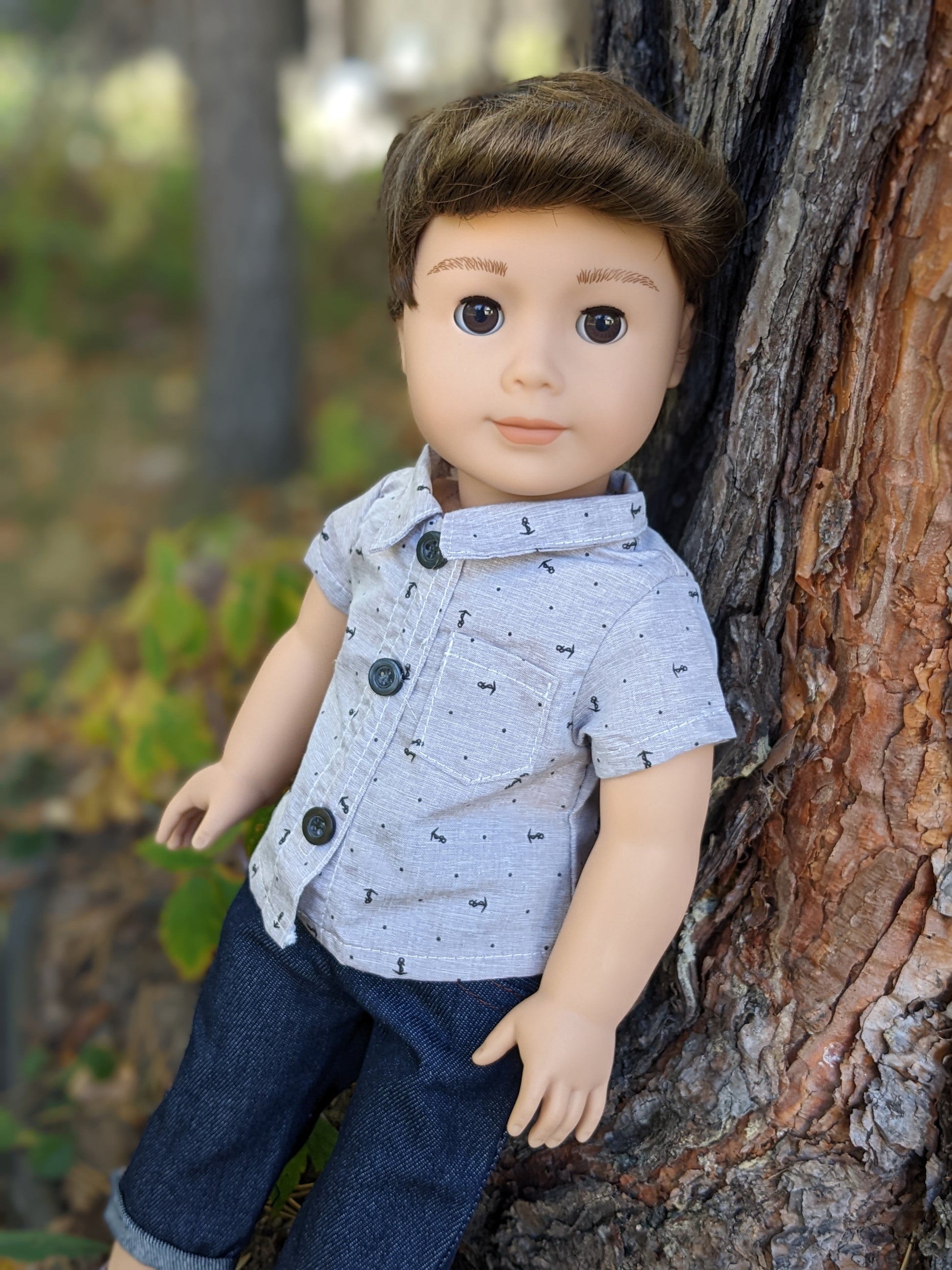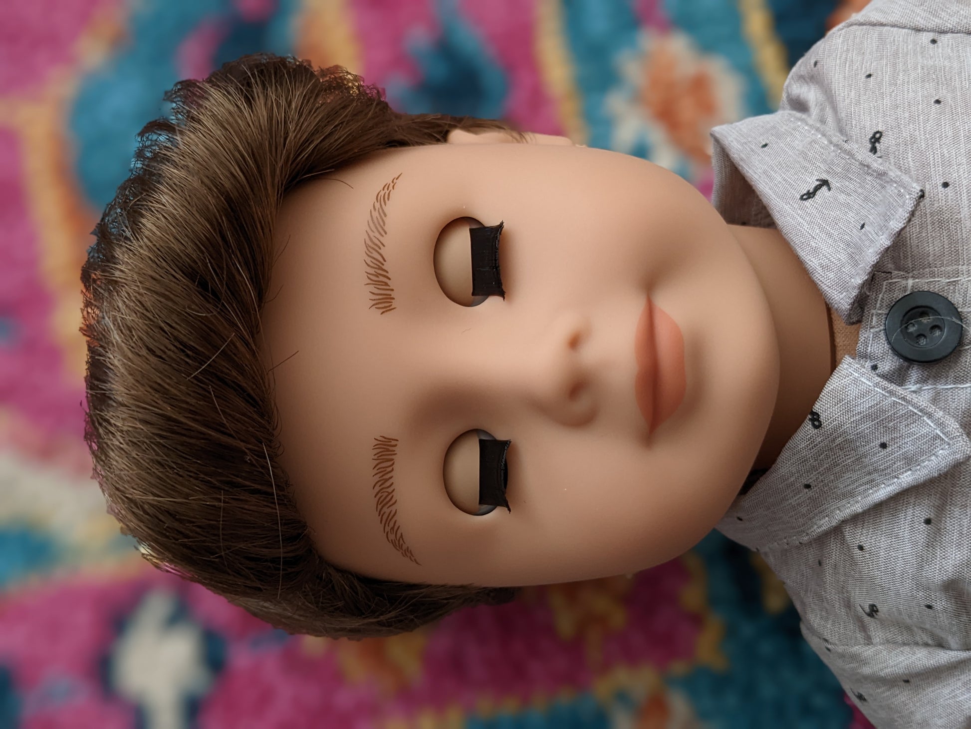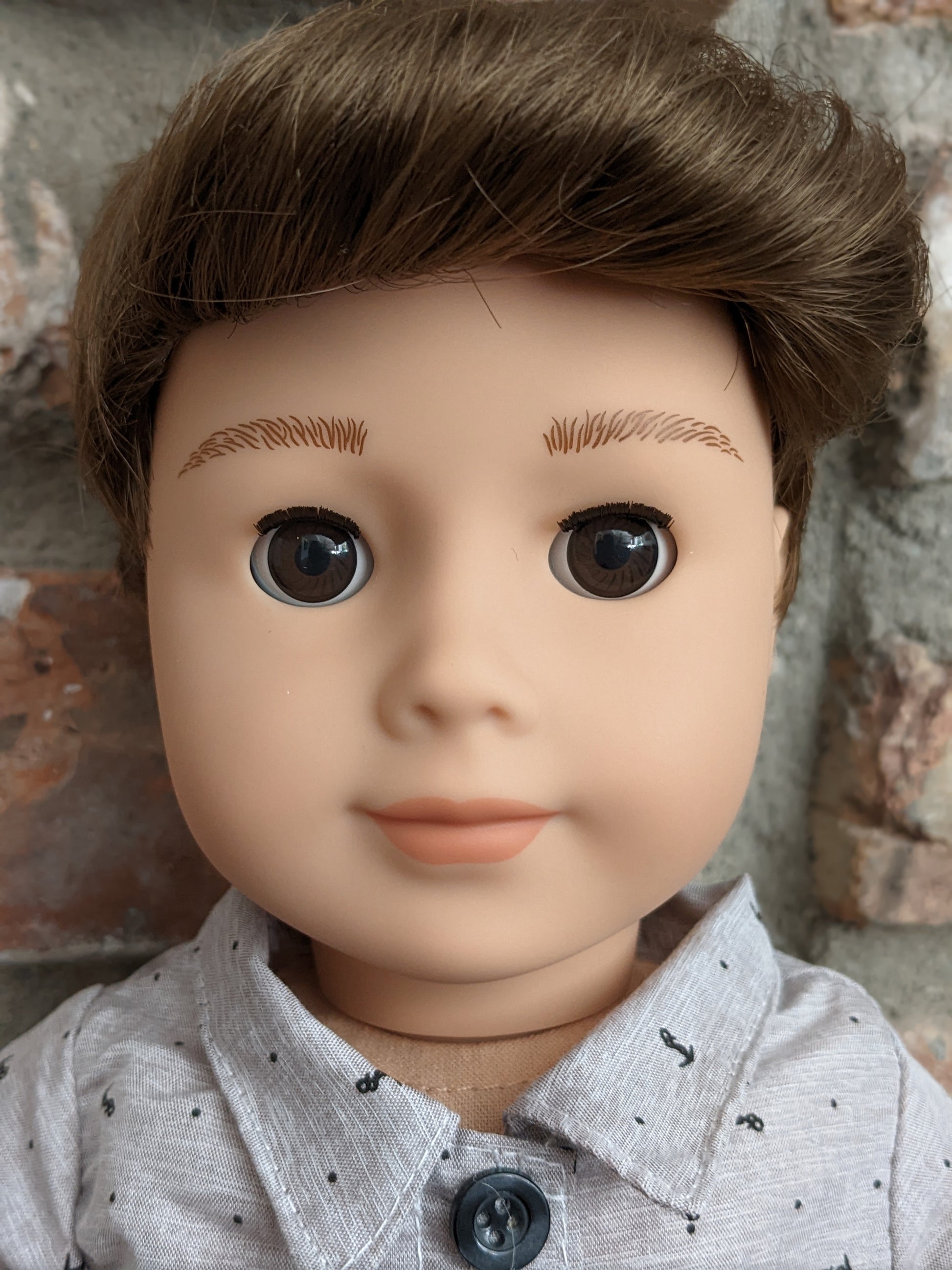 This one of a kind OOAK custom American Girl doll was created with a brand new Truly Me 104 doll, a brown wig from a new Logan doll, and brown eyes. He may have some minor shine marks from handling. He comes with the outfit pictured.