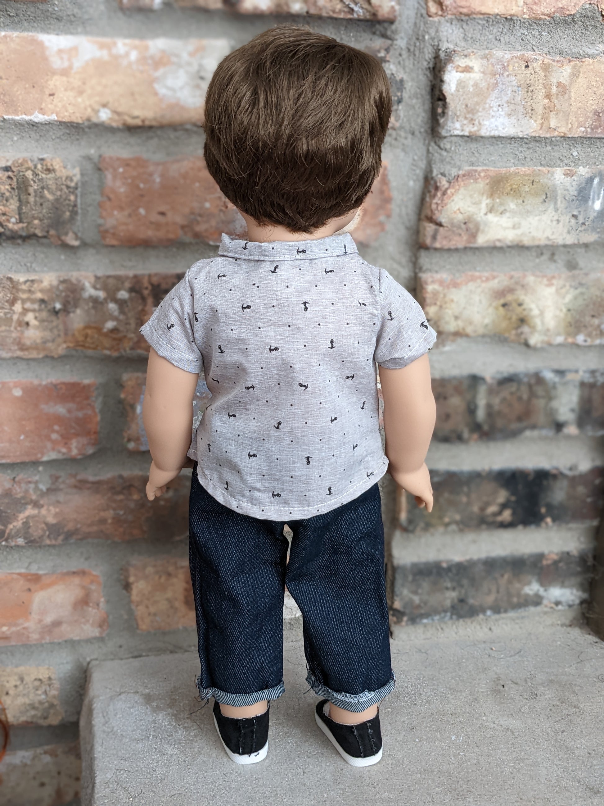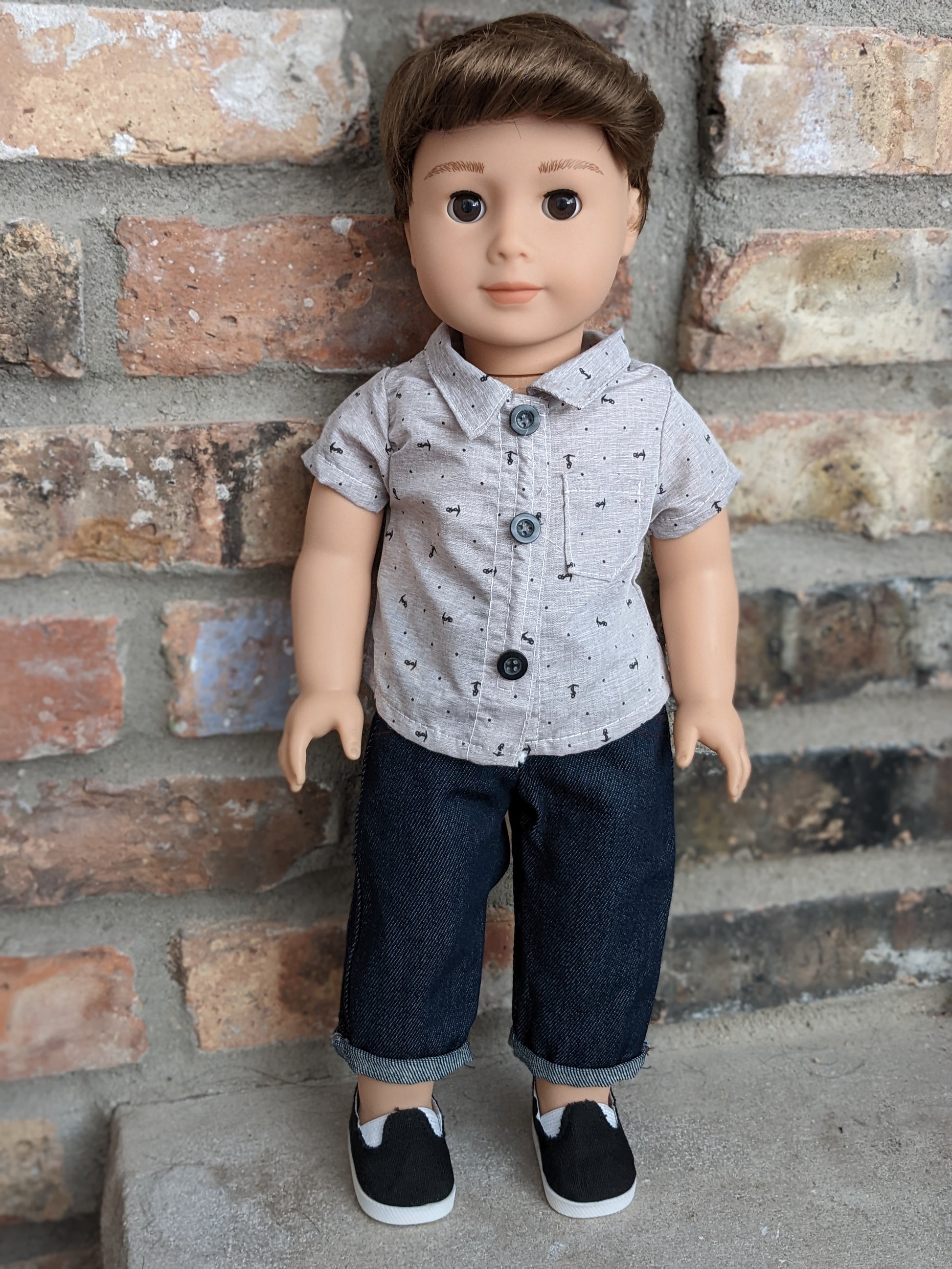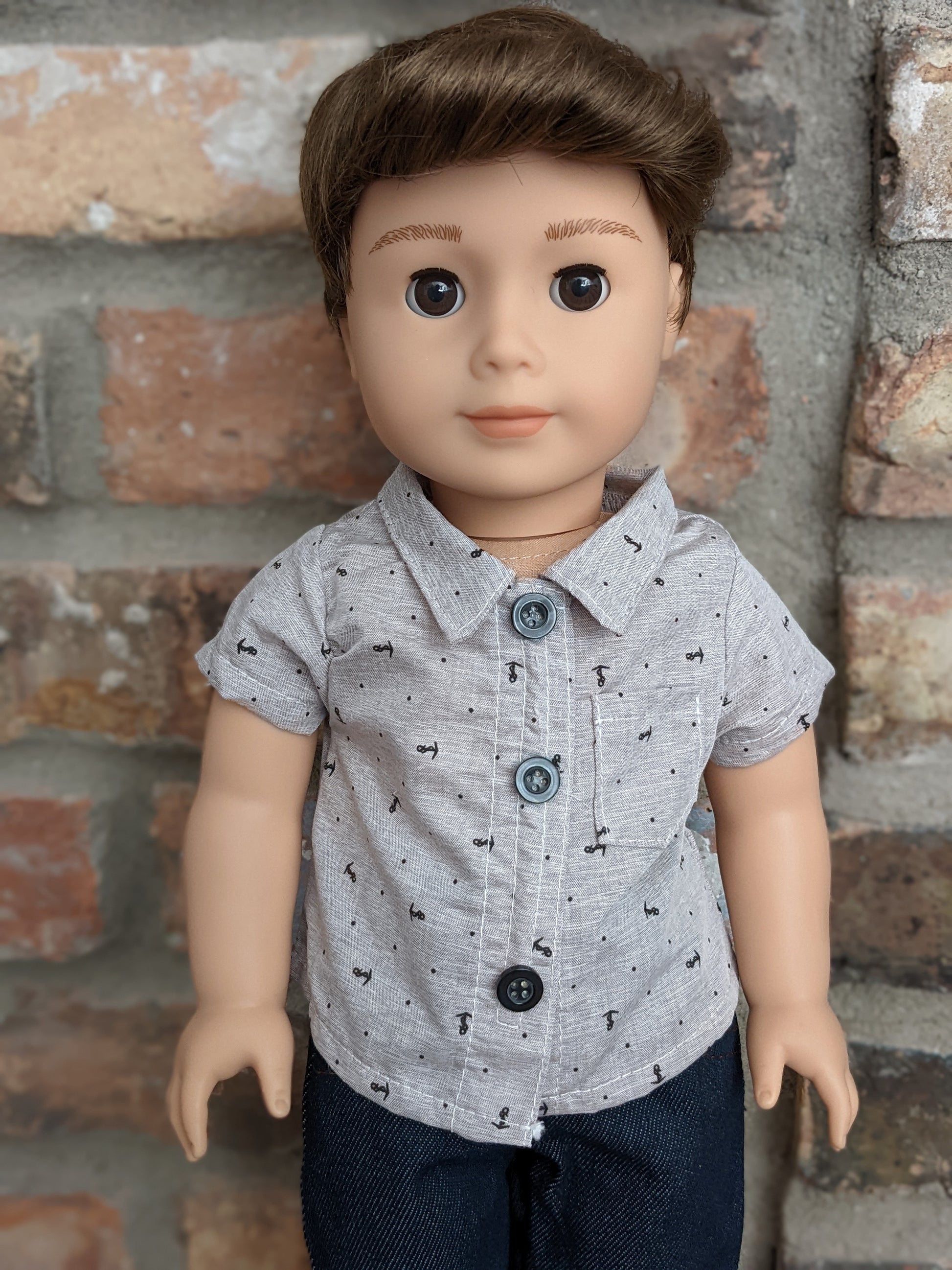 This one of a kind OOAK custom American Girl doll was created with a brand new Truly Me 104 doll, a brown wig from a new Logan doll, and brown eyes. He may have some minor shine marks from handling. He comes with the outfit pictured.