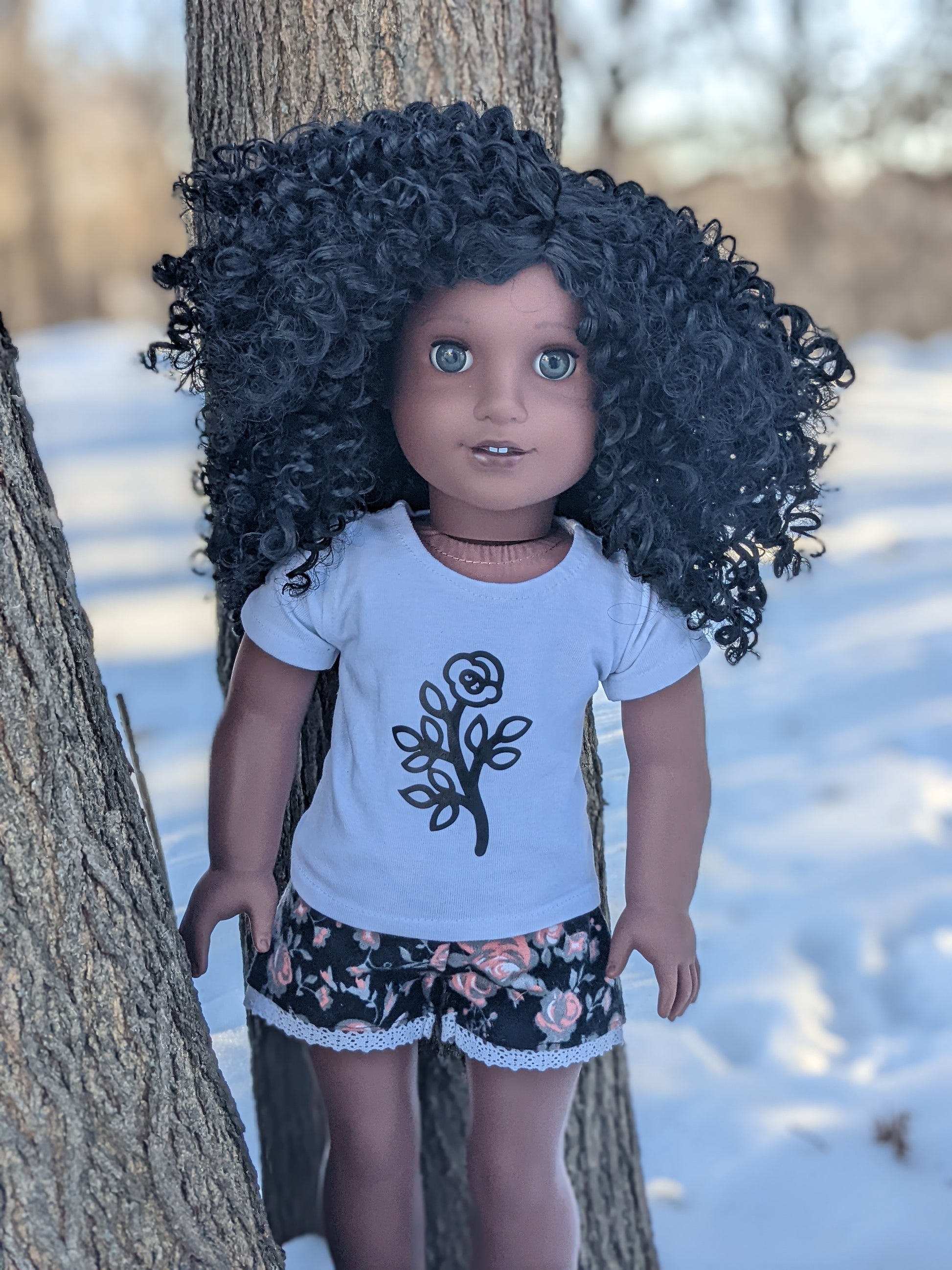 Willow- black curly hair, grey eyes, dark skin tone, Josefina face mold