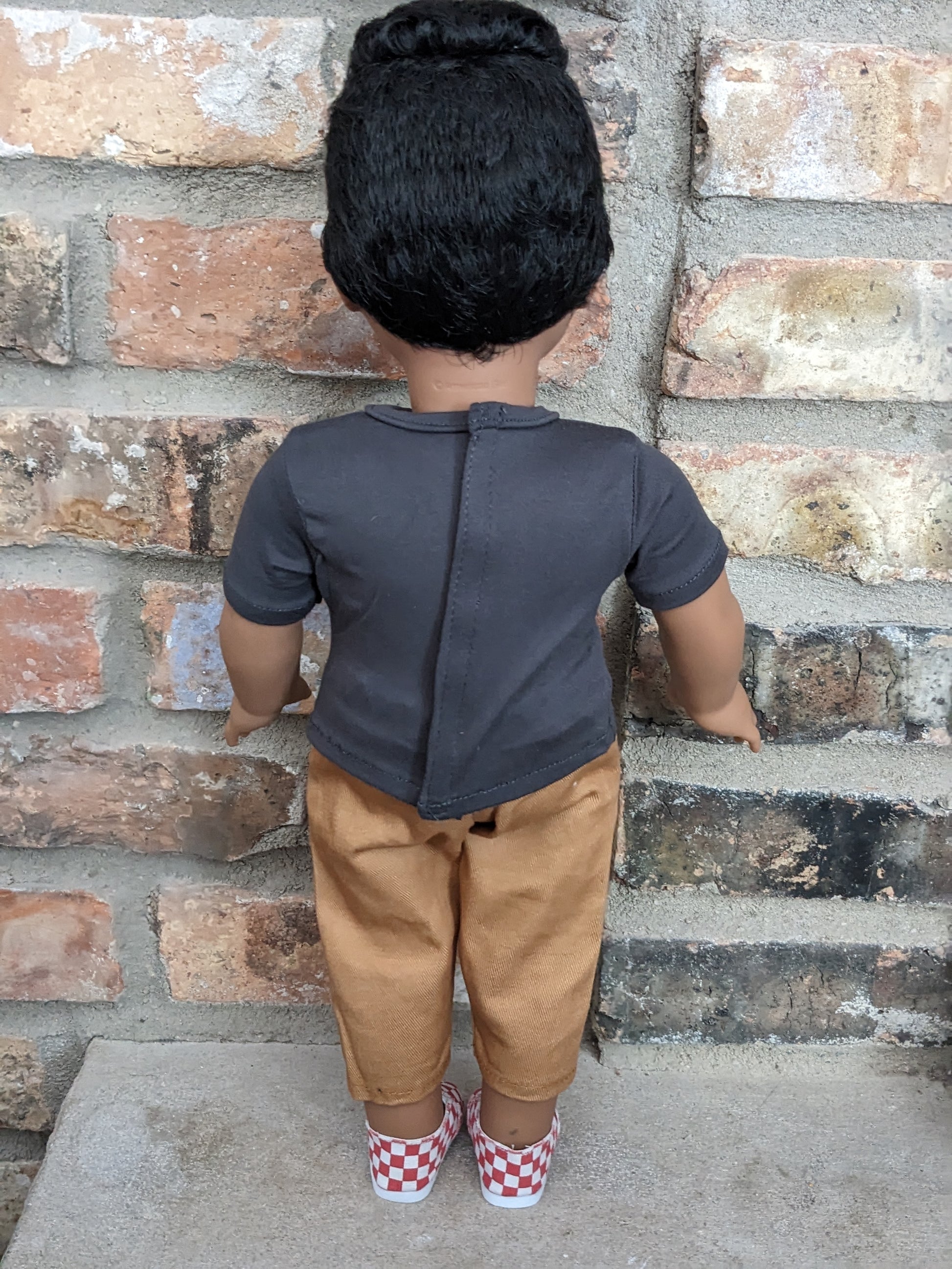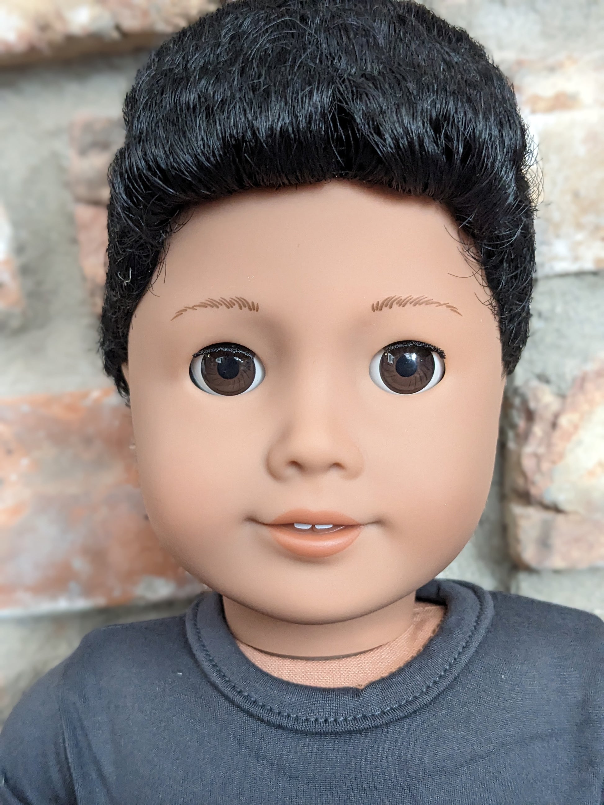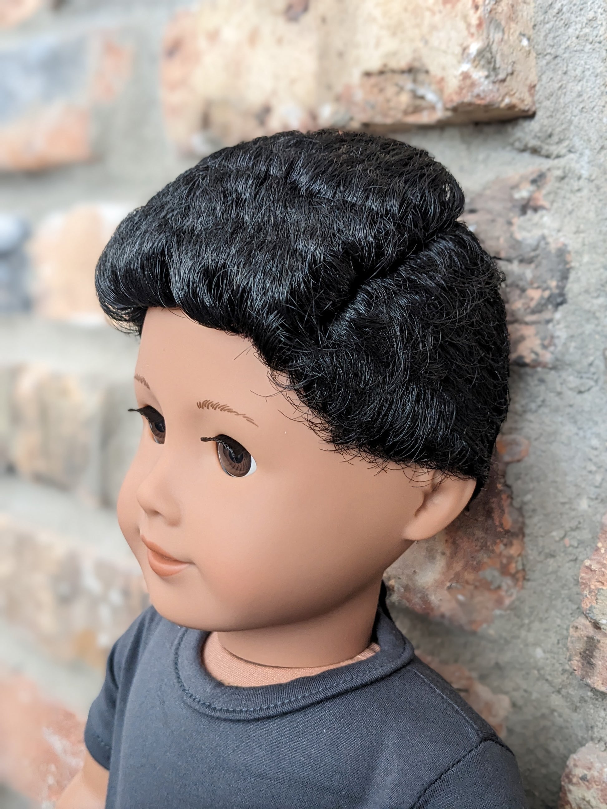 This one of a kind OOAK custom American Girl doll was created with a brand new Truly Me doll, a black wig, and brown eyes. He may have some minor shine marks from handling. He comes with the outfit pictured. Despite being made from a new doll, he has a mark on the back of one of his legs.
