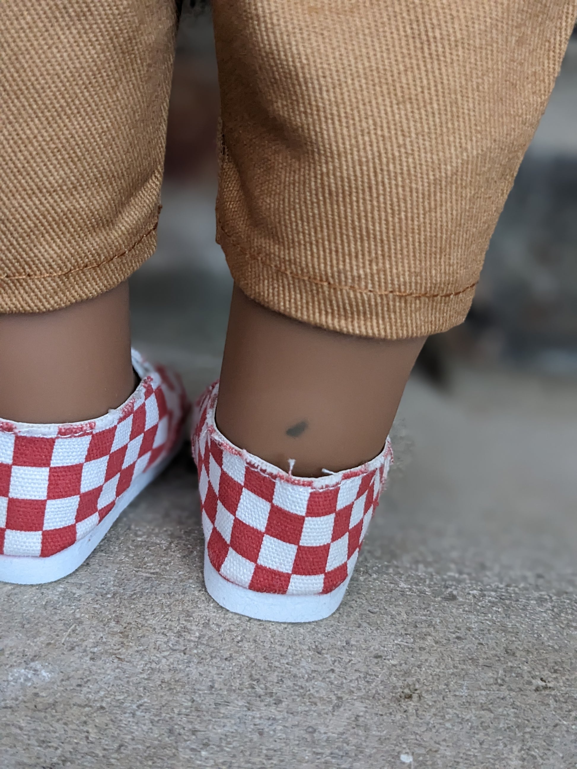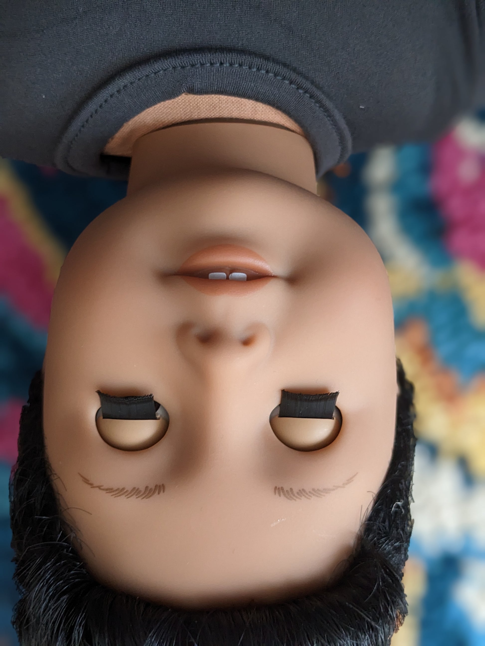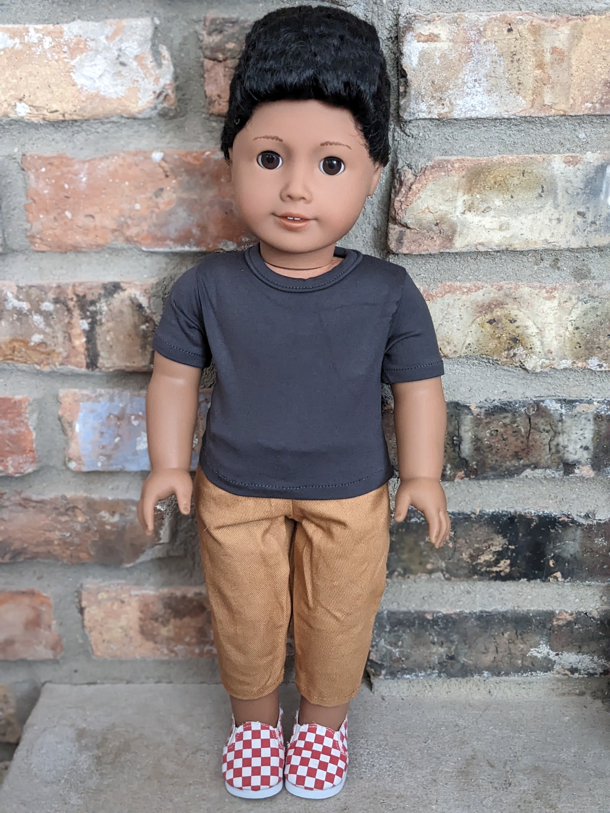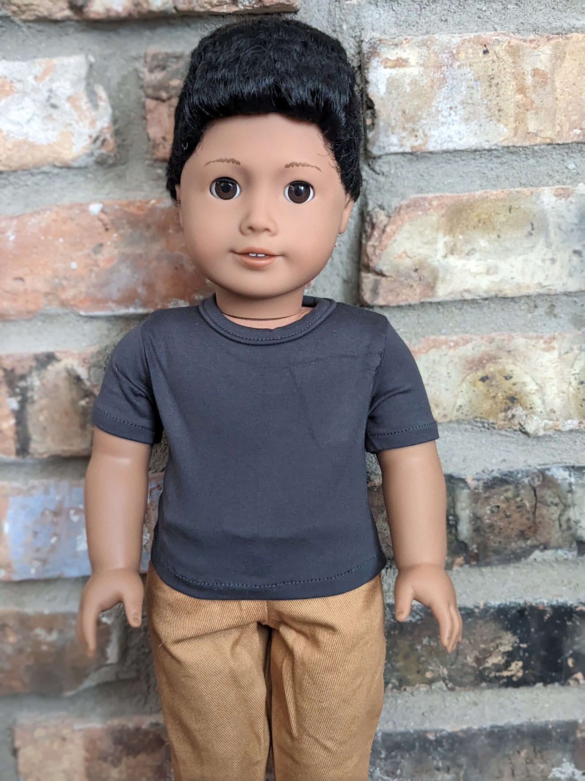 This one of a kind OOAK custom American Girl doll was created with a brand new Truly Me doll, a black wig, and brown eyes. He may have some minor shine marks from handling. He comes with the outfit pictured. Despite being made from a new doll, he has a mark on the back of one of his legs.