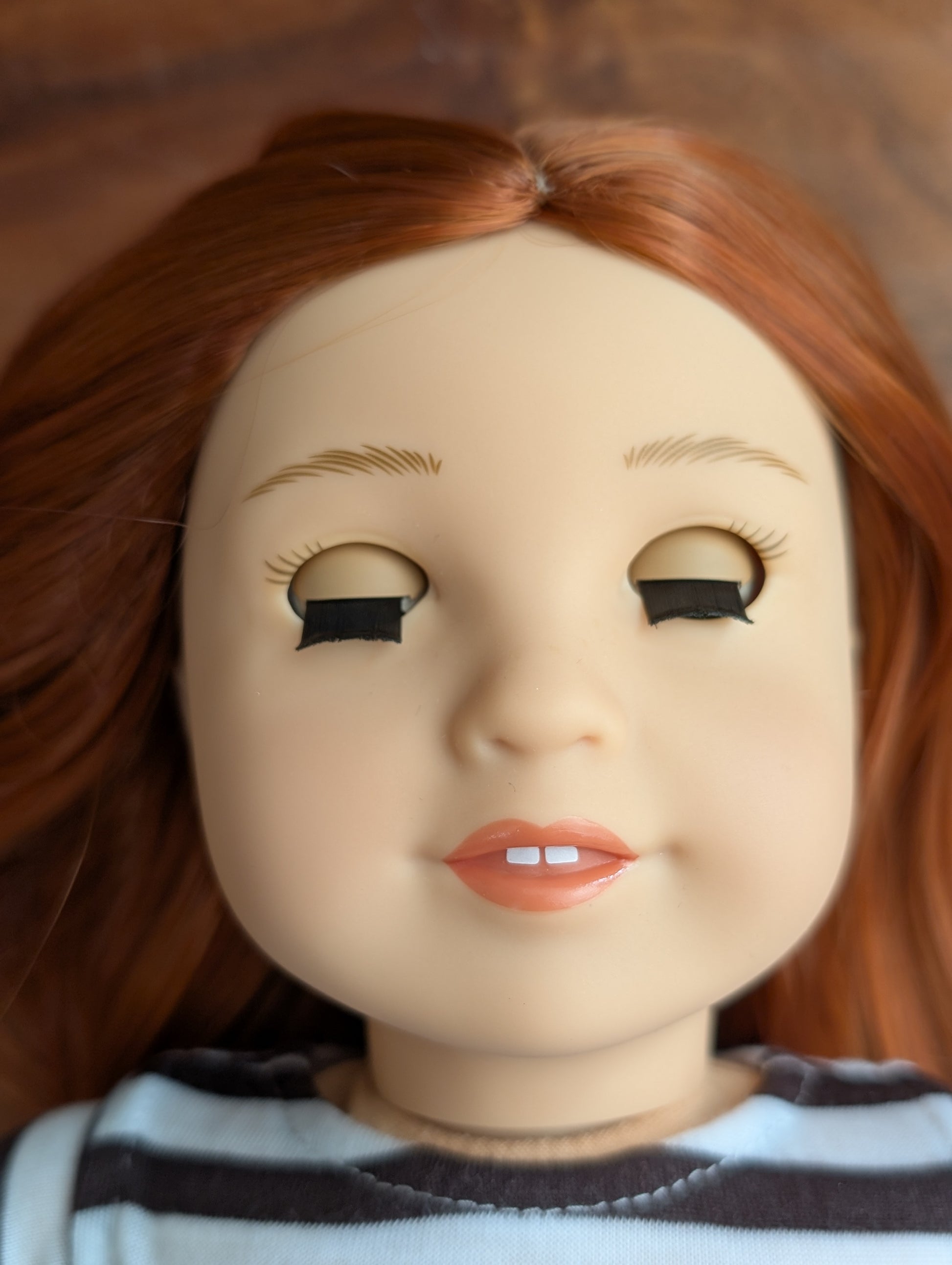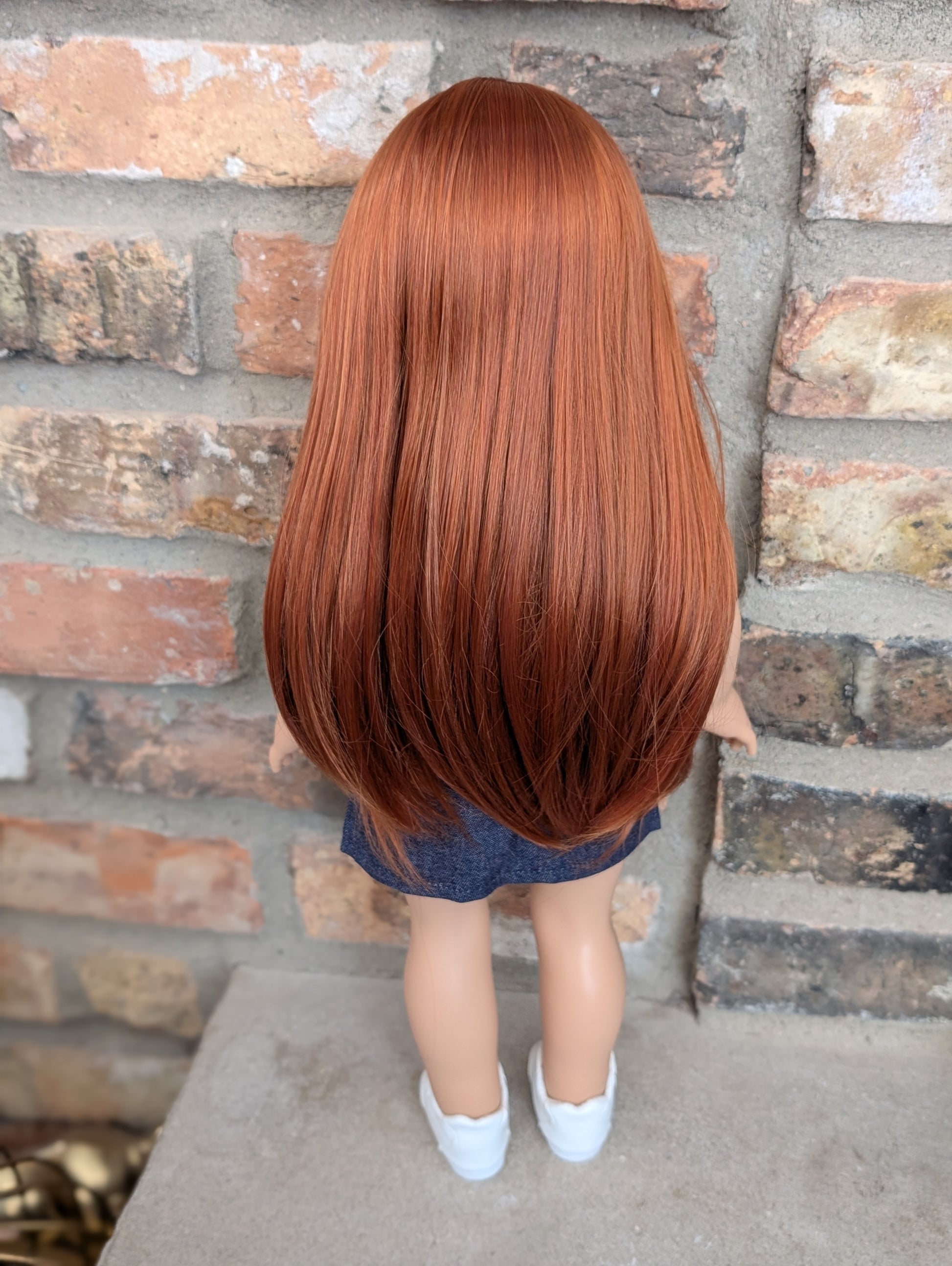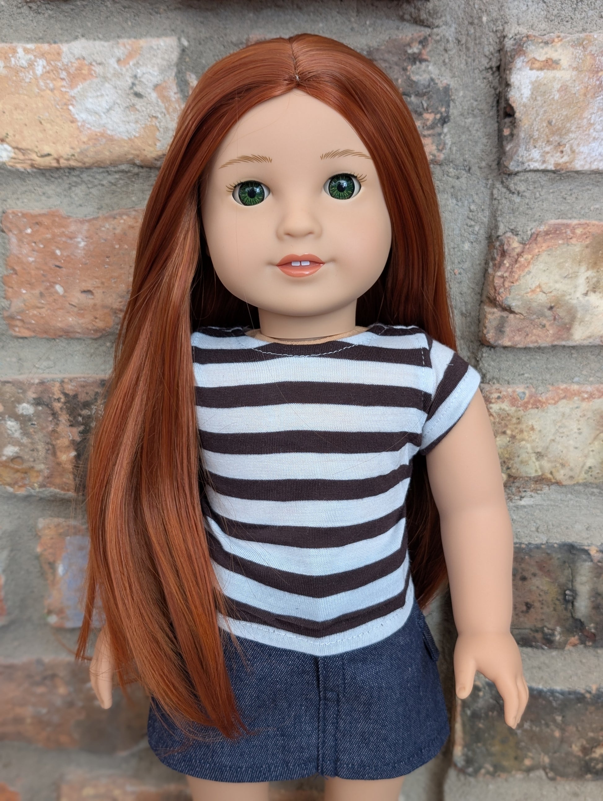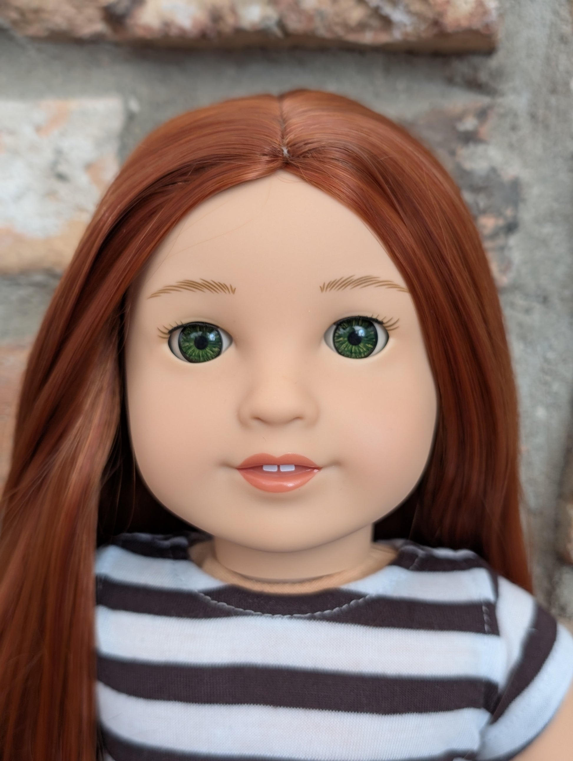 This one of a kind OOAK custom American Girl doll was created with a brand new doll, a red wig, and green eyes from a BeForever Felicity doll. She has lip gloss that was hand painted and sealed. She may have some minor shine marks from handling. She comes with the outfit pictured.